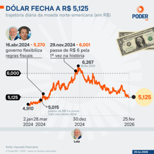 Moeda norte-americana fechou cotada em R$ 5,125; Ibovespa, principal índice da B3, registrava alta de 0,08% às 17h O dólar comercial encerrou o pregão desta 4ª feira (25.fev.2026) cotado em R$ 5,125, queda de aproximadamente 0,60% no fechamento em relação …
